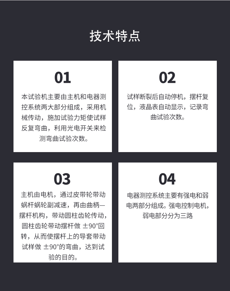 主要技術參數 1.試樣直徑:Φ0.3-Φ10mm 2.試樣長度:150-250mm 3.彎曲角度:±90°(平面彎曲) 4.計數范圍:99999 5.顯示方式:液晶顯示,自動記錄次數 6.彎曲速度:≤60rpm 7.電機功率:1.5kw 8.電 源:220V,50Hz 9.外形尺寸:740*628*1120mm 10.主機重量:約200 kg 結構特征與工作原理 本試驗機主要由主機和電器測控系統兩大部分組成,采用機械傳動,施加試驗力矩使試樣反復彎曲,利用光電開關來檢測彎曲試驗次數。試樣斷裂后自動停機,擺桿復位,液晶表自動顯示,記錄彎曲試驗次數。 主機 主機由電機,通過皮帶輪帶動蝸桿蝸輪副減速,再由曲柄—擺桿機構,帶動圓柱齒輪傳動,圓柱齒輪帶動擺桿做±90°回轉,從而使擺桿上的導套帶動試樣做±90°的彎曲,達到試驗的目的。在圓柱齒輪上裝有記數用的裝置,試樣每彎曲一次,光電開關采集一次信號,這樣就達到了記數的目的。 試驗結束后,如果擺桿沒有停到中間位置,按復位鍵,則由另一只光電開關采集信號,使擺桿恢復到中間位置。 在擺桿上,裝有撥桿,而撥桿上裝有內徑大小不同的導套,針對不同粗細的試樣,把撥桿調整到不同的高度,并使用不同的導套。將導套放入撥桿孔內,用扭簧將其別住,并使其與撥桿導通。 在擺桿的下方,裝有試樣夾持裝置。手動旋轉絲杠,使活動鉗口平移,將試樣夾緊。對不同直徑的試樣,更換相應的鉗口和導套(鉗口和導套上有標記)。