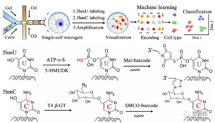 然而,5hmU的化學(xué)結(jié)構(gòu)與5hmC高度相似,且其細(xì)胞豐度不到后者的1%.因此,兩者的特異識別、區(qū)分極其困難,更無法在單細(xì)胞水平分析并探究其細(xì)胞功能單細(xì)胞5hmU/5hmC單分子可視化分析示意圖針對上述問題,西安交通大學(xué)生命學(xué)院生命分析化學(xué)與儀器研究所趙永席教授團(tuán)隊(duì)發(fā)展了可特異區(qū)分5hmU與5hmC的化學(xué)酶(chemoenzymatic)標(biāo)記法,并構(gòu)建單細(xì)胞凝膠液滴微流控DNA擴(kuò)增檢測系統(tǒng),實(shí)現(xiàn)單細(xì)胞5hmU/5hmC的單分子可視化分析,揭示細(xì)胞類型特異的表觀修飾位點(diǎn)數(shù)目、分布規(guī)律等分子特征,并利用深度學(xué)習(xí)算法,首次證實(shí)5hmU與5hmC可作為標(biāo)志物,區(qū)分正常、致癌、高度轉(zhuǎn)移的乳腺細(xì)胞系相關(guān)成果以《微流凝膠編碼的單細(xì)胞5hmU/5hmC可視化分析》 (Differentiated Visualization of Single-Cell 5Hydroxymethylpyrimidines with Microfluidic Hydrogel Encoding)為題發(fā)表在國際化學(xué)領(lǐng)域權(quán)威期刊《美國化學(xué)會志》(Journal of the American Chemical Society)上.