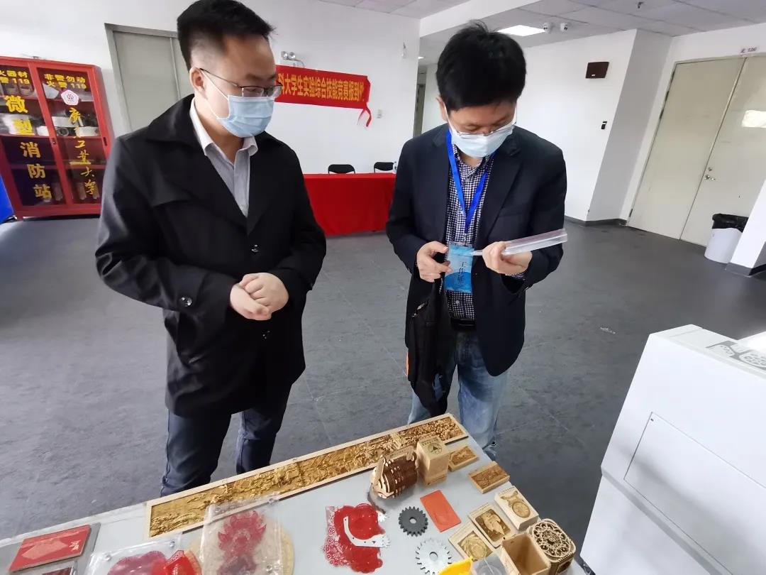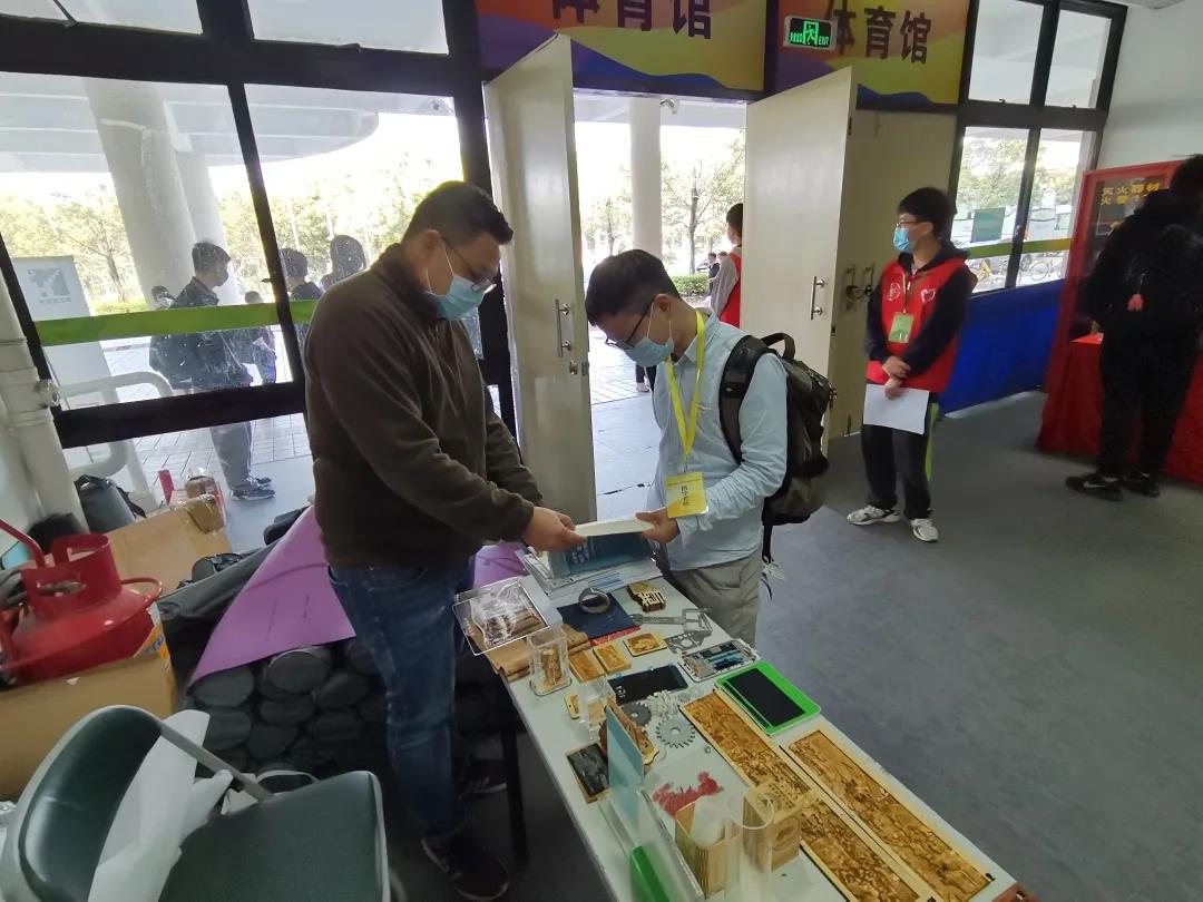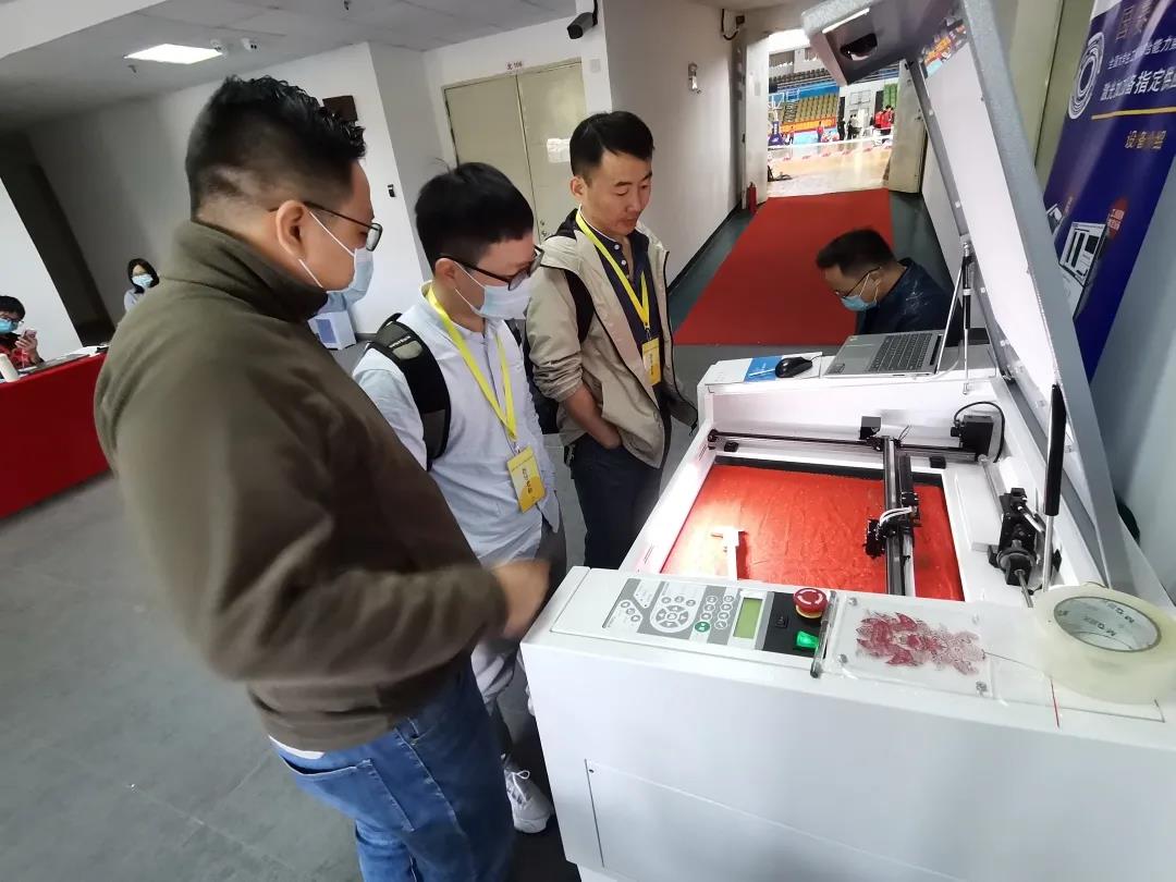 向參觀者演示機器切割剪紙。華之尊激光設備光斑極細,激光與卡紙的接觸面積極小,從而在切割過程中不會產生發(fā)黑、發(fā)黃、起火及碳化等效果,切割R弧可達0.2mm,切縫小于0.03mm,能將平面圖案通過華之尊激光精確切割出來。