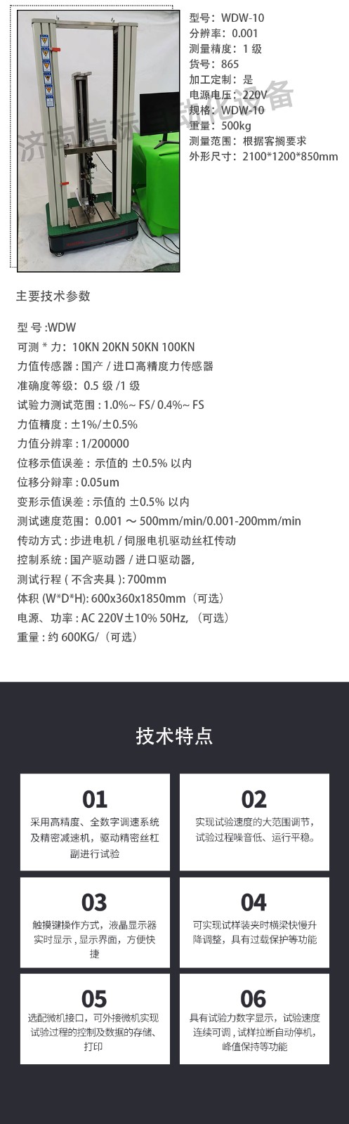 基本信息 型號(hào):WDW-10 分辨率:0.001 測(cè)量精度:1級(jí) 貨號(hào):865 加工定制:是 電源電壓:220V 重量:500kg 測(cè)量范圍:根據(jù)客戶要求 外形尺寸:2100*1200*850mm 可測(cè)試驗(yàn)力: 10KN 20KN 50KN 100KN 力值傳感器: 國(guó)產(chǎn)/進(jìn)口高精度力傳感器 準(zhǔn)確度等級(jí): 0.5級(jí)/1級(jí) 試驗(yàn)力測(cè)試范圍: 1.0%~ FS/ 0.4%~ FS 力值精度: ±1%/±0.5% 力值分辨率: 1/200000 位移示值誤差: 示值的±0.5%以?xún)?nèi) 位移分辯率: 0.05um 變形示值誤差: 示值的±0.5%以?xún)?nèi) 測(cè)試速度范圍: 0.001~500mm/min/0.001-200mm/min 傳動(dòng)方式: 步進(jìn)電機(jī)/伺服電機(jī)驅(qū)動(dòng)絲杠傳動(dòng) 控制系統(tǒng): 國(guó)產(chǎn)驅(qū)動(dòng)器/進(jìn)口驅(qū)動(dòng)器, 測(cè)試行程(不含夾具): 700mm 體積(W*D*H): 600x360x1850mm(可選) 電源、功率: AC 220V±10% 50Hz,(可選) 重量: 約600KG/(可選) 自動(dòng)停機(jī)裝置 機(jī)械、程控
