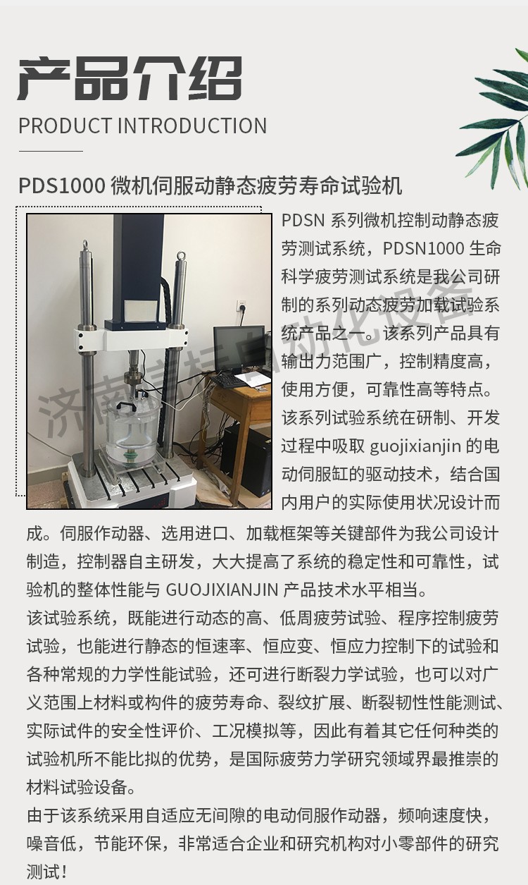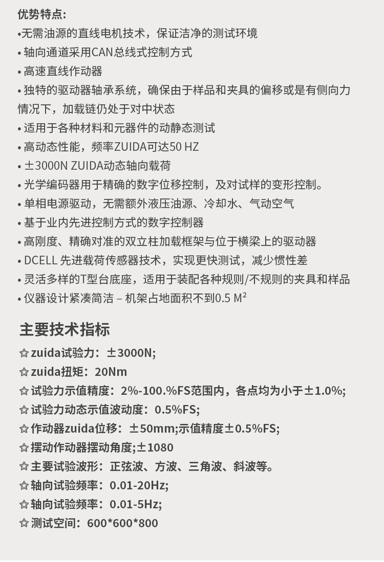 該試驗系統(tǒng),既能進行動態(tài)的高、低周疲勞試驗、程序控制疲勞試驗,也能進行靜態(tài)的恒速率、恒應變、恒應力控制下的試驗和各種常規(guī)的力學性能試驗,還可進行斷裂力學試驗,也可以對廣義范圍上材料或構件的疲勞壽命、裂紋擴展、斷裂韌性性能測試、實際試件的安全性評價、工況模擬等,因此有著其它任何種類的試驗機所不能比擬的優(yōu)勢,是國際疲勞力學研究領域界最推崇的材料試驗設備。 由于該系統(tǒng)采用自適應無間隙的電動伺服作動器,頻響速度快,噪音低,節(jié)能環(huán)保,非常適合企業(yè)和研究機構對小零部件的研究測試! 2.優(yōu)勢特點: ?無需油源的直線電機技術,保證潔凈的測試環(huán)境 ? 軸向通道采用Can總線式控制方式 ? 高速直線作動器 ? 獨特的驅動器軸承系統(tǒng),確保由于樣品和夾具的偏移或是有側向力情況下,加載鏈仍處于對中狀態(tài) ? 適用于各種材料和元器件的動靜態(tài)測試 ? 高動態(tài)性能,頻率zuida可達50 Hz ? ±3000N zuida動態(tài)軸向載荷 ? 光學編碼器用于精確的數(shù)字位移控制,及對試樣的變形控制。 ? 單相電源驅動,無需額外液壓油源、冷卻水、氣動空氣 ? 基于業(yè)內(nèi)先進控制方式的數(shù)字控制器 ? 高剛度、精確對準的雙立柱加載框架與位于橫梁上的驅動器 ? Dcell 先進載荷傳感器技術,實現(xiàn)更快測試,減少慣性差 ? 靈活多樣的T型臺底座,適用于裝配各種規(guī)則/不規(guī)則的夾具和樣品