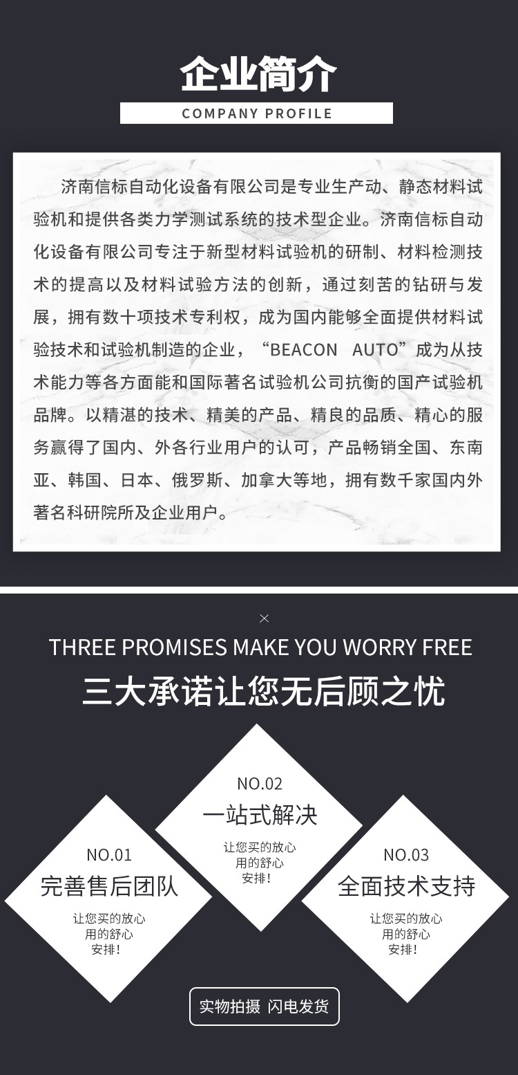 濟南信標自動化設(shè)備有限公司主要生產(chǎn):動靜態(tài)萬能疲勞試驗機,接骨板彎曲試驗機,縫合線拉伸疲勞試驗機,髖膝關(guān)節(jié)磨損試驗機,電子萬能試驗機、液壓萬能試驗機、巖石三軸、四軸,電液拉力試驗機,材料試驗機,高低溫蠕變,高低頻疲勞,拉伸、扭轉(zhuǎn)、杯突等二十多個系列兩千多個的品種。